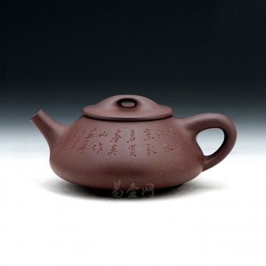 整款器型非常到位,石瓢挺俊之美,淋漓尽致。造型简练,古朴大方,刚中有劲。流把钮均为暗接手法,与壶身宛若一体,可见功力。原矿底槽清制作,其泥质非常细腻,流把张弛有度,比例恰到好处,堪称工料俱佳的一款全手石瓢,壶身刻绘“汲来江水烹新茗 买尽吴山当画屏”,另一面刻绘山水意境图,如此风雅的器型怎能不收藏!